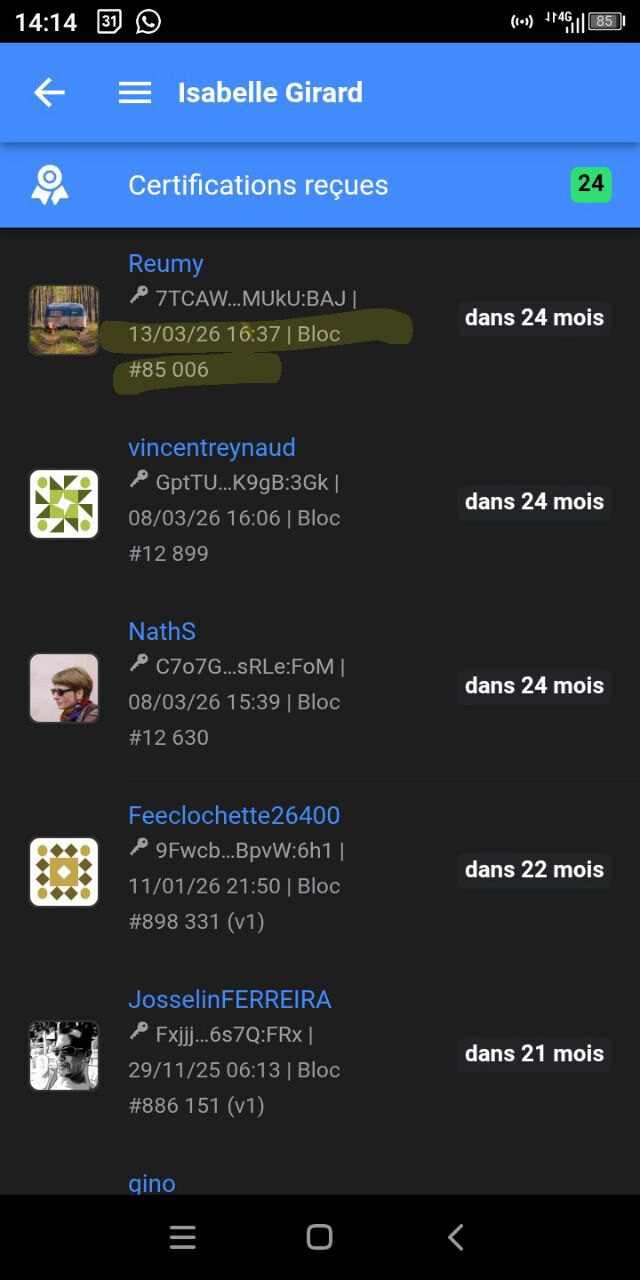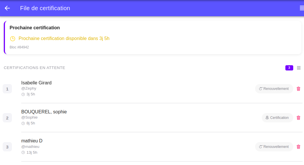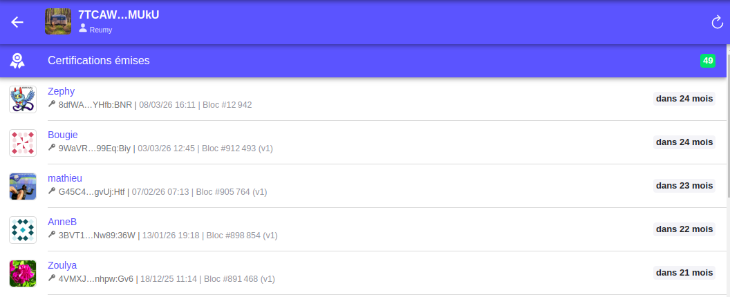 NOTA : tu ne devrais pas pouvoir mettre en liste à certifier des personnes que tu as déjà certifiées, d’où la notion de renouvellement. Ce contrôle a lieu côté client, pas serveur, donc si tu as ce comportement, c’est un bug. Idéalement tu repostes le même avec les petites précisions, ce sera directement exploitable par pokaClaude.