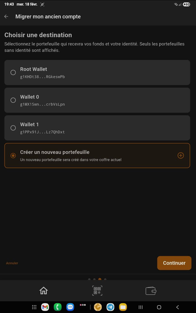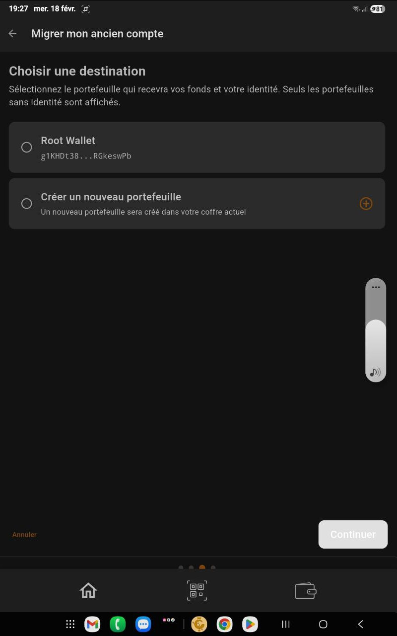 Pour finir j’ai choisi root Wallet et là il tourne en boucle et n’arrive pas à faire la migration à savoir :