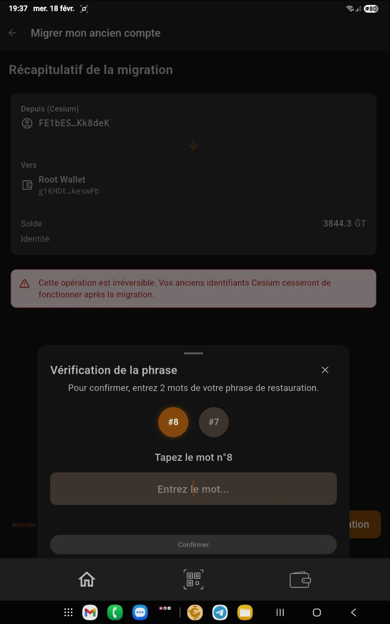 J’ai testé le processus de migration (en version 0.6.1) et globalement ça se passe bien. Le seul truc un peu pénible (déjà signalé) c’est quand on saisit le mot de passe Cesium, le clavier disparaît toutes les deux ou trois lettres.