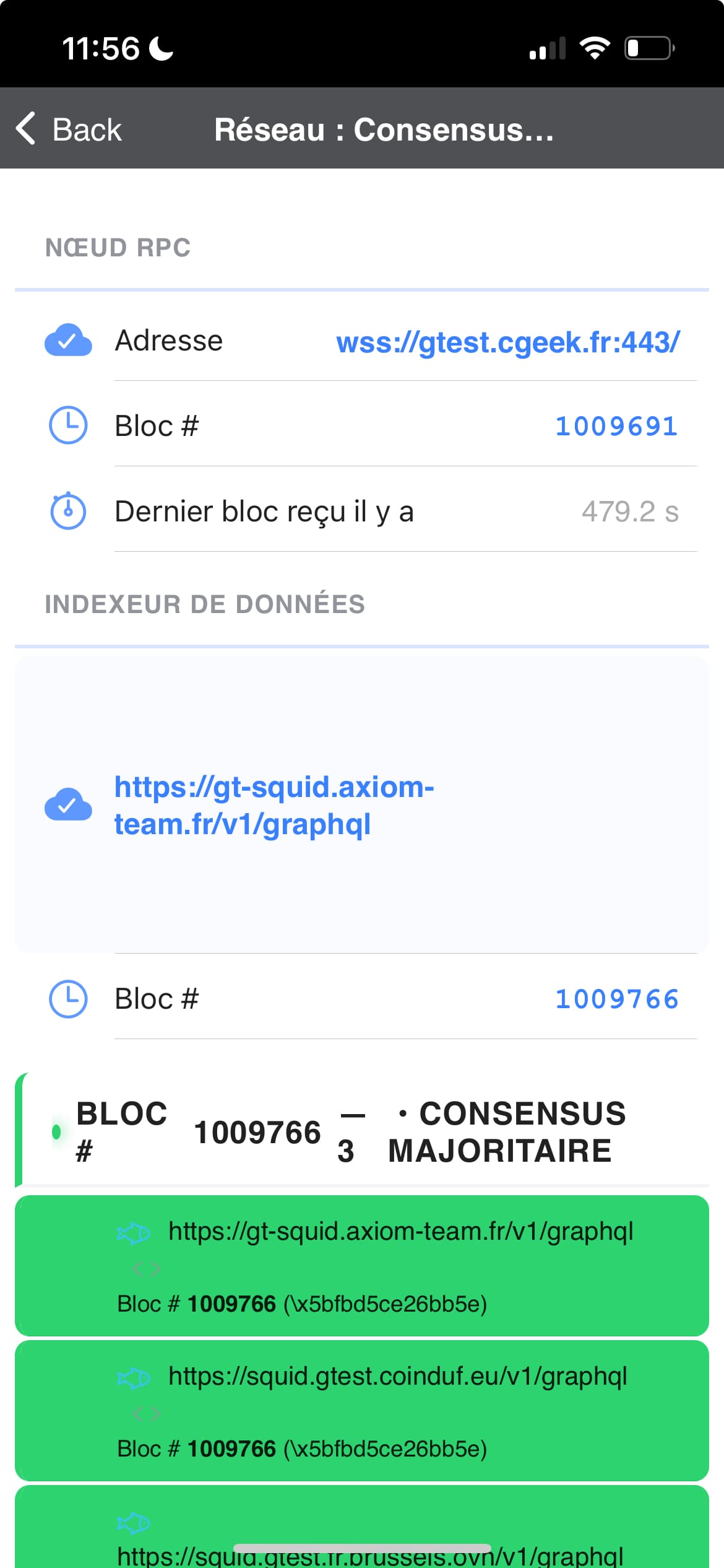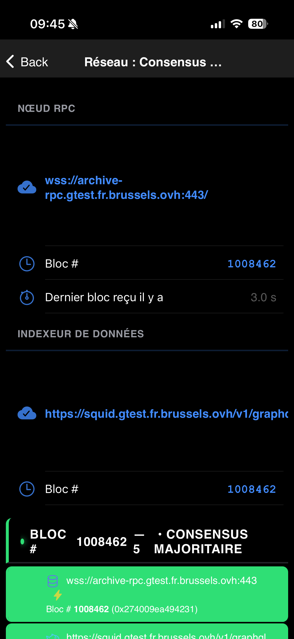 Alors ce n’est pas tout à fait systématique … là après 15 minutes je rallume mon iPhone et retombe sur cet écran : la connexion est toujours UP (je reçois des blocs toutes les 6").