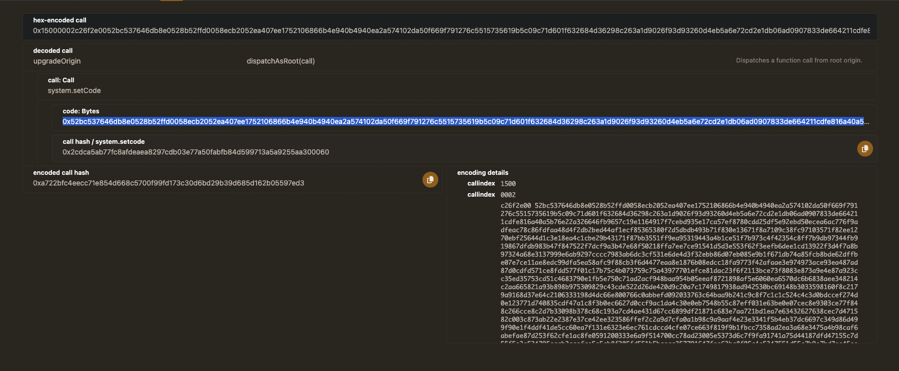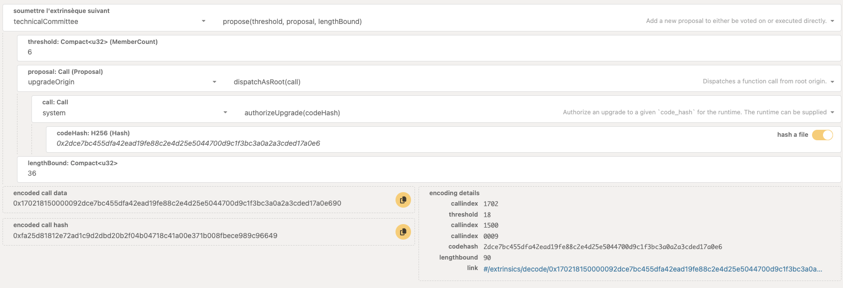 Donc le hash du call upgradeOrigin.dispatchAsRoot(system.setCode(code)) est : blake2-256(bin(0x15000002<hex_code_bytes>))