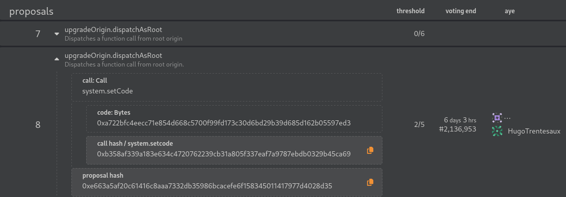 Je vois que la proposition de runtime upgrade n’a toujours que deux votes. Je suggère d’abandonner cette proposition et d’en soumettre une nouvelle en passant par system.authorizeUpgrade, afin de vous faire la main sur la meilleure manière de procéder. Ce sera également plus facile à vérifier pour les autres membres du CT.