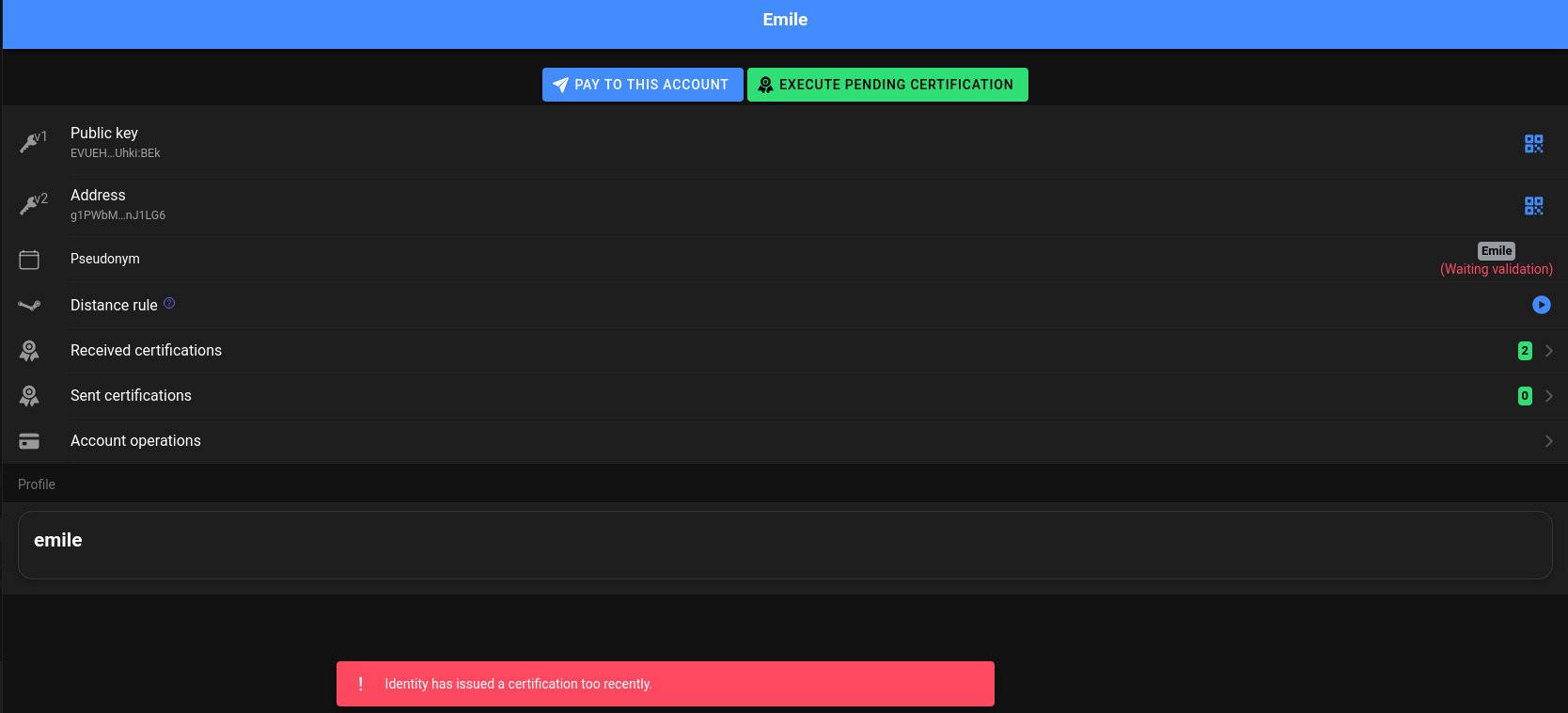 Nestor (g1L6XjArL3z8S2XbNCHc8UMR1ES8D8kirrTCFRt9SUf4hH3mQ) essaie de certifier Émile (g1PWbMGsmhKHmMkcgJbtpRBHAxY5yKEsZBvZBj6hKzGnJ1LG6), mais nous avons l’erreur: