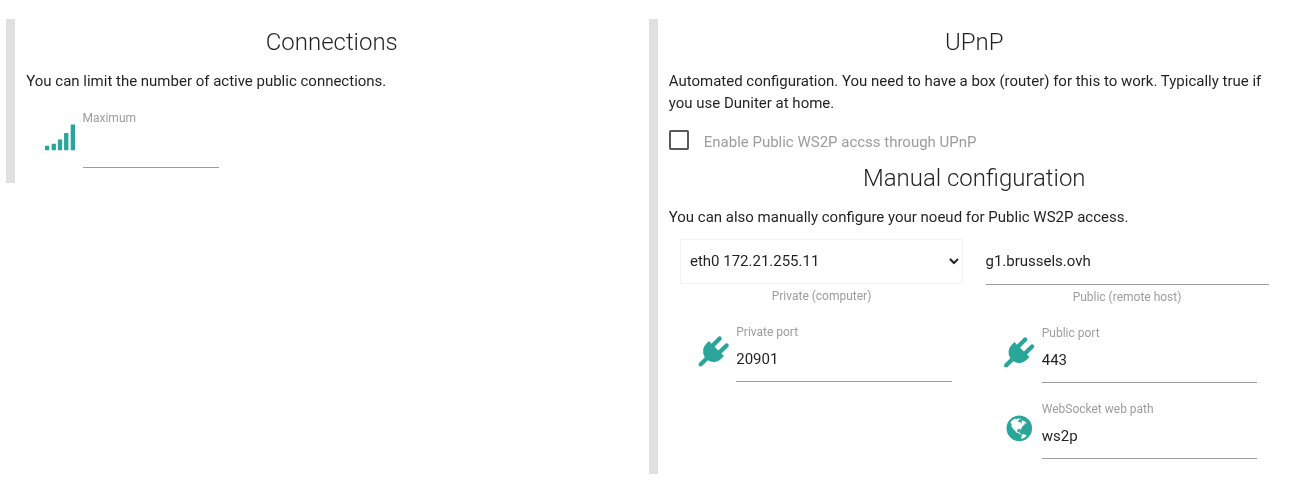 pour faire court, pour résoudre le pb d’affichage de wsp “privé” dans cesium, j’utilise l’image “pinidh/duniter:1.8.7” au lieu de l’image “pinidh/duniter:1.8.7-pini2”. Dans cette dernière version le port ws2p (20901) n’est pas bindé dans le container, un contournement possible est de faire la config réseau via l’interface d’admin.