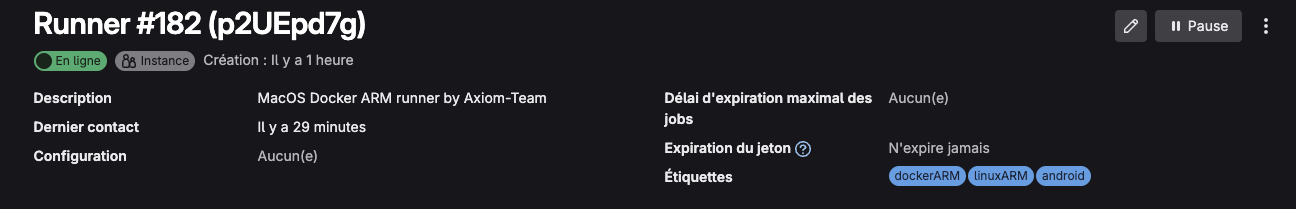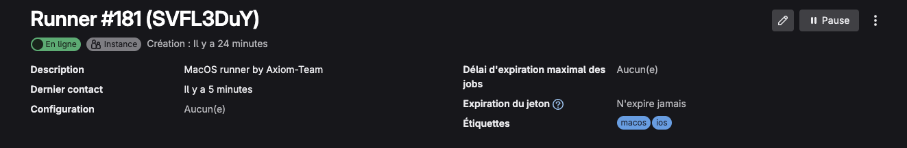 Il s’agit d’un runner de type shell (pas docker donc), de manière à pouvoir faire des builds MacOS et iOS natif.