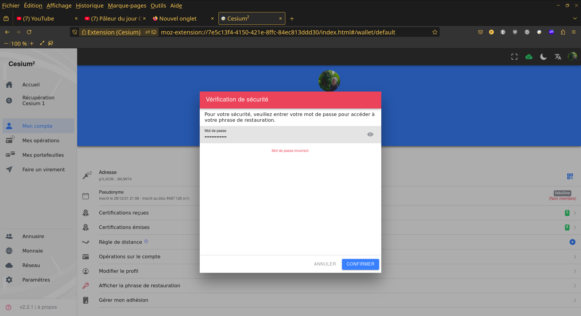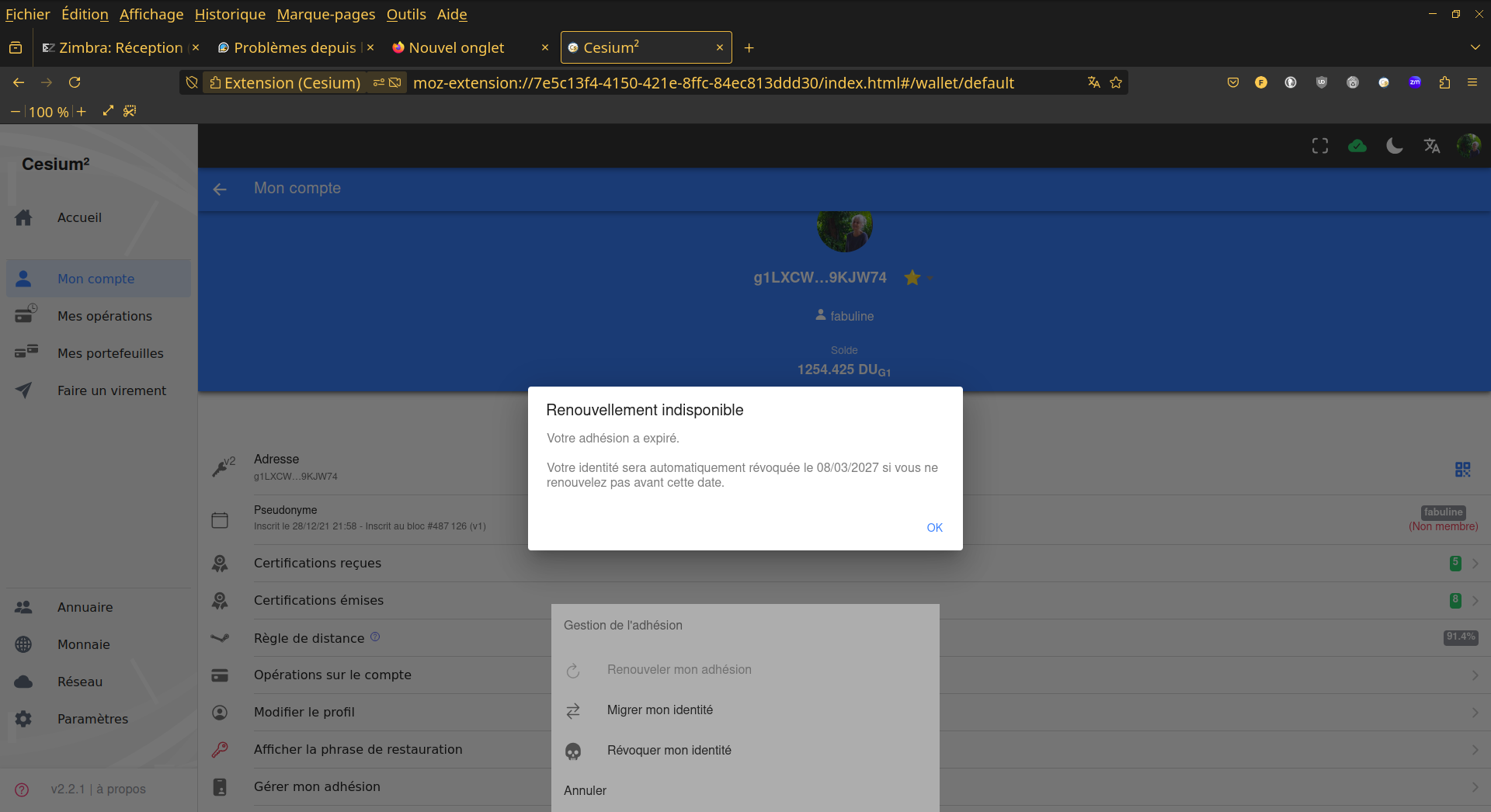 depuis la migration, mon compte s’affiche comme non-membre, je ne peux plus recevoir ni envoyer de certifications. Je peux recevoir des versements mais ne peux plus en effectuer. Lorsque je veux afficher la phrase de restauration, automatiquement il m’est proposé mon ancien mot de passe sur césium1 qui comportait 13 caractères!?….HELP! j’ai joint une capture d’écran pour une meilleure compréhension!