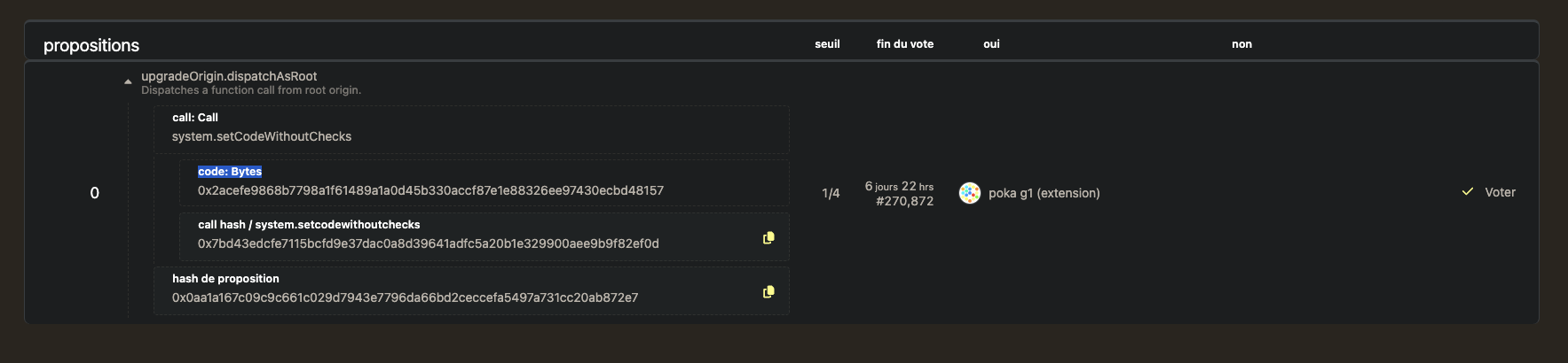 Vérifiez ici que le hash de la preimage correspond bien au code: Bytes de la preimage référencée dans la proposal.