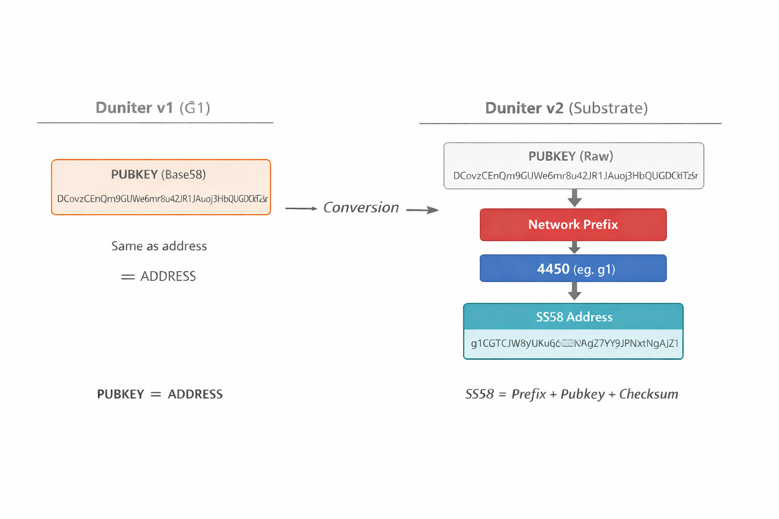 I wanted to clarify the difference between pubkey and address in Duniter v1 and v2, as it can be a source of confusion for developers moving between versions or building apps like Cesium².