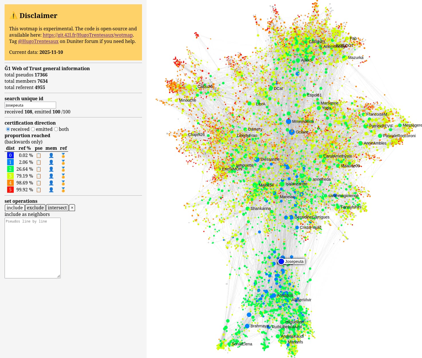 Josepeuta, avec 108 certifications reçues et 100 émises, est la personne ayant émis le plus de certifications. Malgré cela, il atteint moins de personnes que Gclaire au bout de trois pas en certifications émises (85% contre 87%).